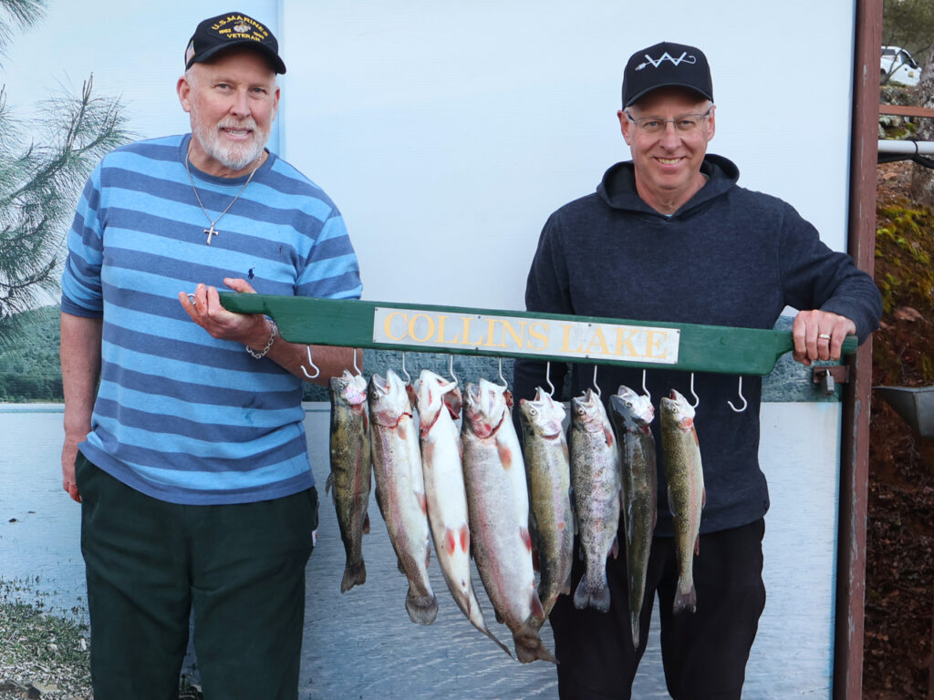 Mitch Ralston and Steve Hulse of Foresthill caught 8 rainbow trout, the biggest weighing in at over six pounds fishing from a boat out near the buoy line along the main channel using orange trolling flies.